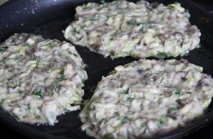 - Смелете тиквички и гъби на едро ренде. Тиквички е по-добре изстискайте малко от излишната течност. Добавете суровото яйце там и подправки. Разбъркайте старателно с лъжица.