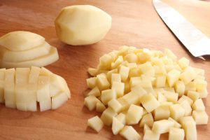 - Сложете картофи във вряща вода. Добавете дафинов лист, черен пипер, сол.